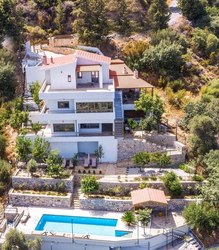 Verkauf Villa, Gazio, Rodias, 250 quadratmeter., Σε οικόπεδο 2500 quadratmeter., 3 Ebenen, Erdgeschoss Fußboden, 4 schlafzimmer, (4 Master), 4 bäder, 1 Küche, 1 Kamin, Fußboden: Fliesen, frames: Aluminium, 2 parking, baujahr: 2010, Status: Luxuriös, Zertifikat Energie: A+, Eigenschaften: Sicherheitstür, Benachrichtigung/Alarm, Abstellraum, Feuerstelle/Kamin , Internet, Electric Appliances, Interne Treppe, Doppelverglasung, Moskito, Terrassen, BBQ/ Grill, Luxus, Luftig, Vorderseite, Hell, Klimaanlage, Sonnenenergiesysteme, Bäume, Pool, Garten , Neubau, Gemalt, Landhaus, Geeignet für den professionellen Einsatz, Autonom - Wärmepumpe Heizung, preis : 900.000€