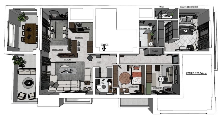 Verkauf Wohnung, Irakleio, Therissos, 127 quadratmeter., 6th Fußboden, 3 schlafzimmer, (1 Master), 2 bäder, 1 WC, 1 Küche, Fußboden: Fliesen, frames: Aluminium, 1 parking, baujahr: 2025, Status: Im Bau, Zertifikat Energie: A+, Eigenschaften: Aufzug, Sicherheitstür, Benachrichtigung/Alarm, CCTV Videoüberwachungsanlage, Abstellraum, Photovolatic Panels, Doppelverglasung, Moskito, Terrassen, Luxus, Dachwohnung, Luftig, Vorderseite, Hell, Klimaanlage, Sonnenenergiesysteme, Neubau, Gemalt, Autonom - Wärmepumpe Heizung, preis : 470.000€