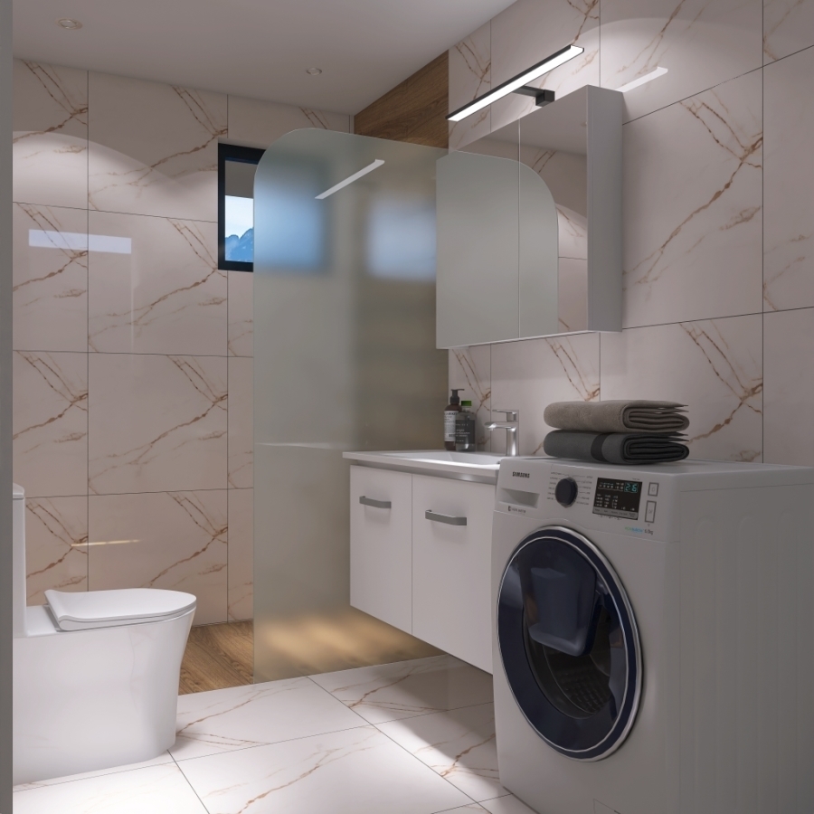 The flooring combines marble and ceramic tiles, reflecting timeless elegance and superior craftsmanship.